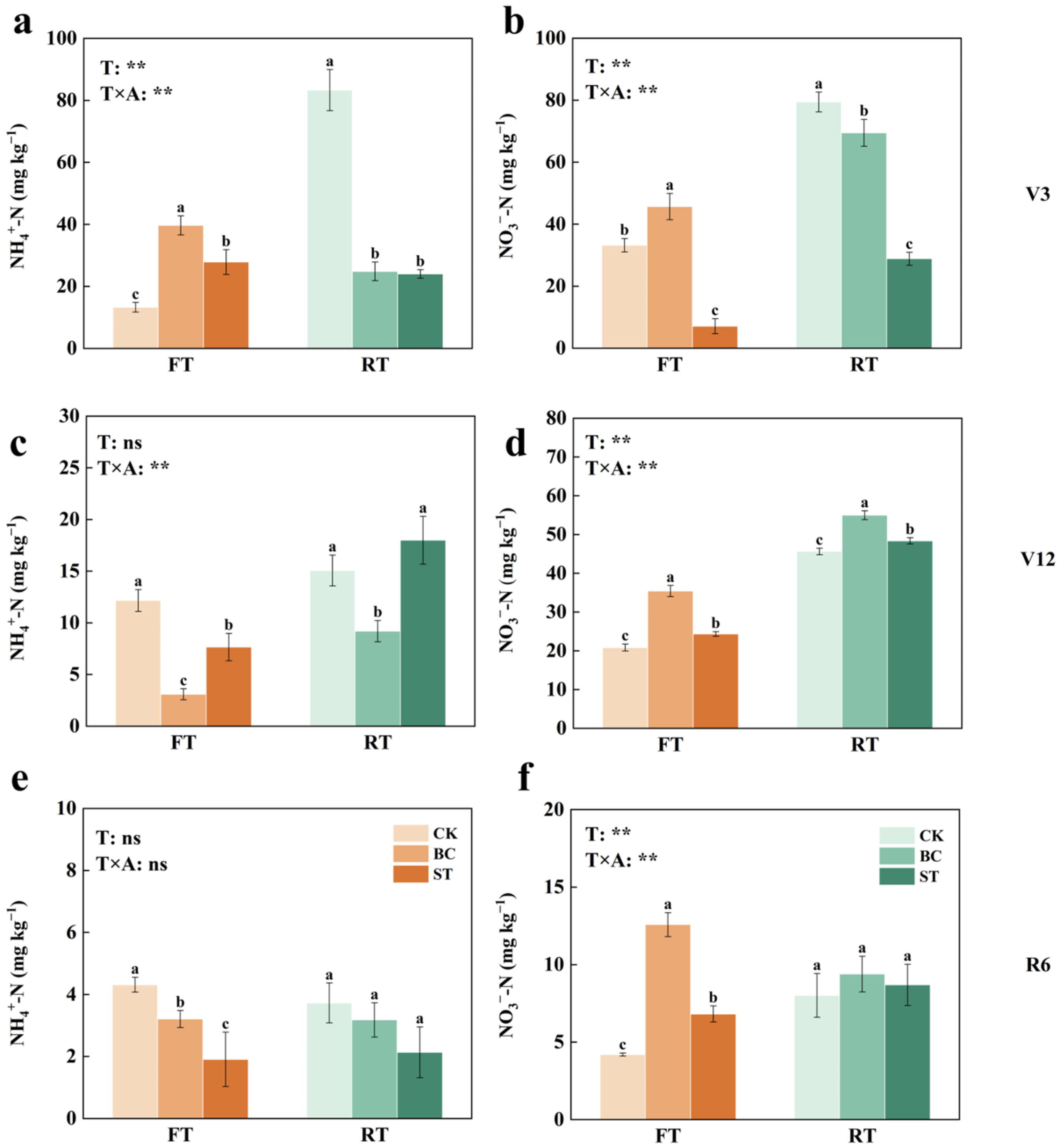 3.2.2. Soil NH4+-N and NO3−-N Content