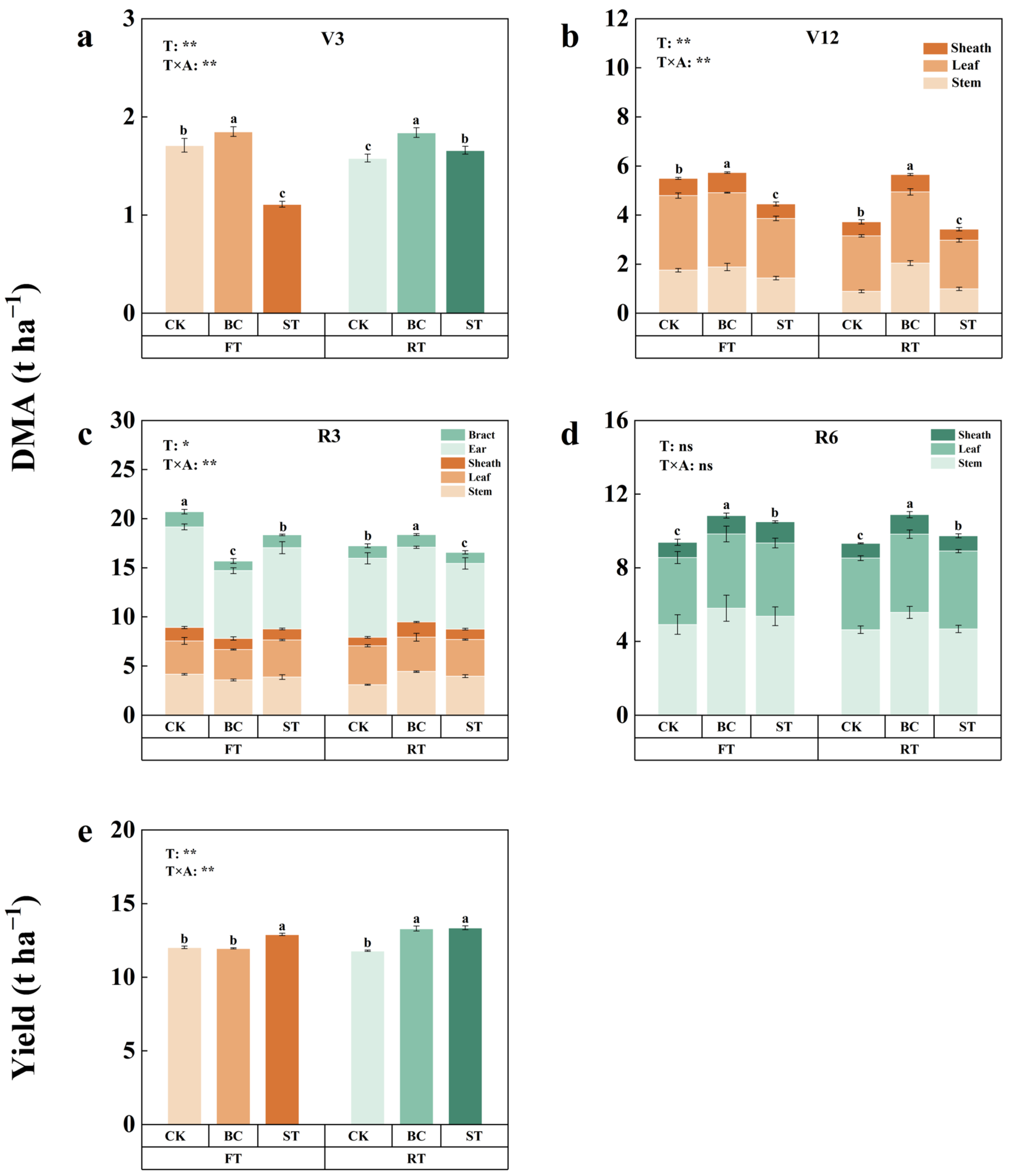 3.4. Effects of Different Treatments on Maize Dry Matter Accumulation and Maize Yield