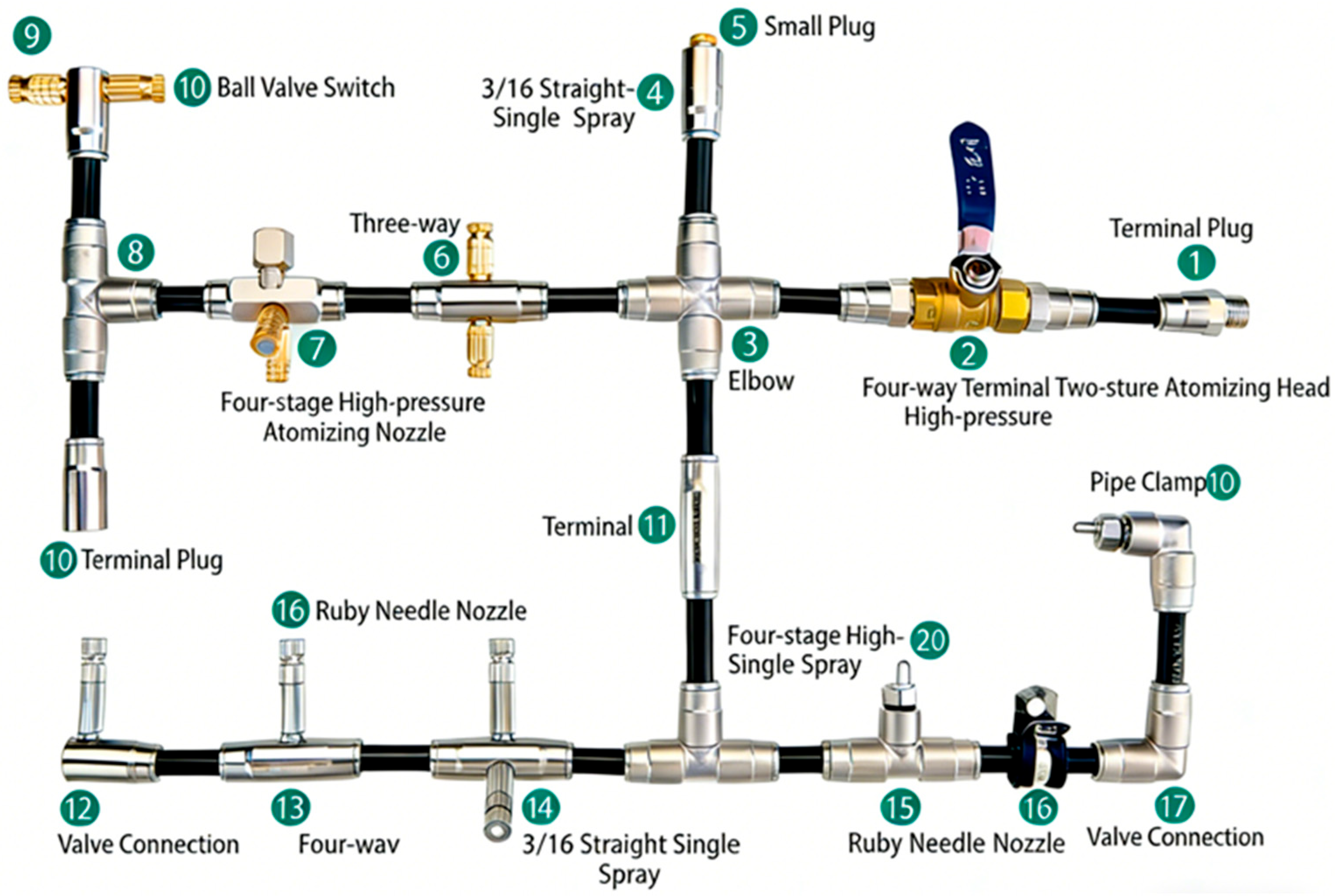2.3. Design and Parameters of the Fixed Pipeline Spray System