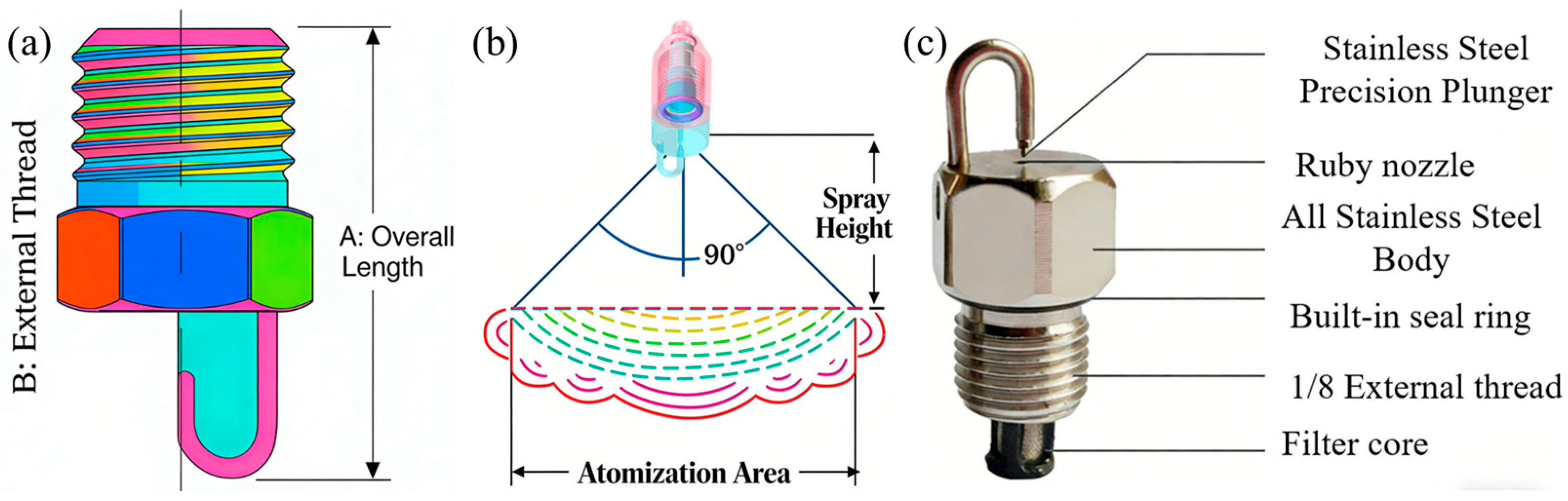 - Ou, M.; Zhang, J.; Du, W.; Wu, M.; Gao, T.; Jia, W.; Dong, X.; Zhang, T.; Ding, S. Design and experimental research of air-assisted nozzle for pesticide application in orchard. Front. Plant Sci. 2024, 15, 1405530. [Google Scholar] [CrossRef]