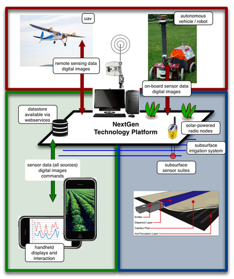 The interacting components of the next-generation, sustainable agriculture technology platform. Research in the green area addresses information flow, accessibility, and areas of human-computer interaction. Research in the blue areas represent advanced agricultural irrigation practices [190]. The red areas represent engineering opportunities to integrate unmanned vehicles in support of data collection, monitoring and intervention.