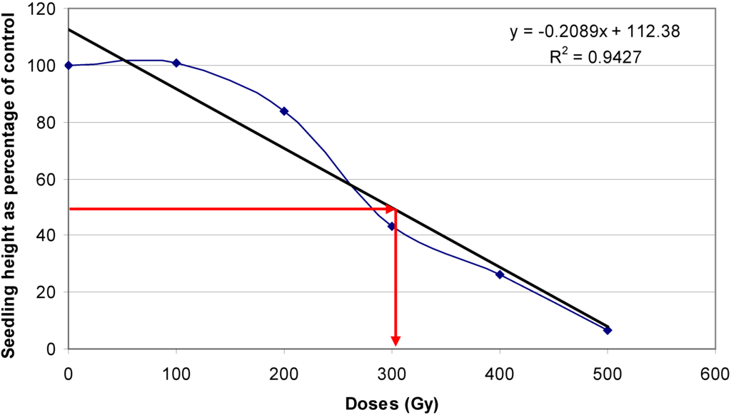 The universally adopted norm is to select a dosage that results in reductions of 30 to 50 or 40 to 60 percent in growth or survival rates, respectively of the first generation mutant (M1) seedlings compared to the seedlings of untreated seeds. Reductions in germination rate, seedling height, survival rate, number of tillers, seed set, and fertility test in the M2 generation as well as chlorophyll mutation are the main parameters measured in the sensitivity tests for determining the optimal doses. The reductions are plotted against the mutagen doses and the dose corresponding to the desired level of reduction is read off the graph. This could also be determined through regression analysis. A sample graph, Figure 1, shows that a 50% reduction in seedling plant height is caused by gamma irradiation at 300 Gy. Doses corresponding to other percentage reductions can be read off the gradient of the graph. Mba et al. [39,40] described the procedures for using the radiosensitivity to the physical mutagen, gamma rays, and the reactions to EMS to ascertain their optimal doses for inducing mutation events in both seed and vegetatively propagated plants.