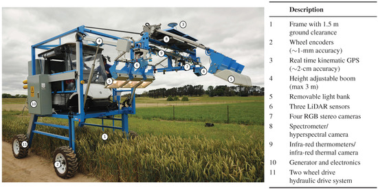 - The next stage of development involves the use of larger and even more sophisticated platforms (or “buggies”), usually with a driver, that can support a wider range of sensors and controls. Some examples of such custom-designed devices for field phenotyping include the system designed in Maricopa (Arizona) described by [37], the “BreedVision” system from Osnabrucke [38,39] and the Avignon system [40] and the “Phenomobile” designed at the High Resolution Plant Phenomics facility in Canberra (described in the following Section 4.1 and Figure 1).