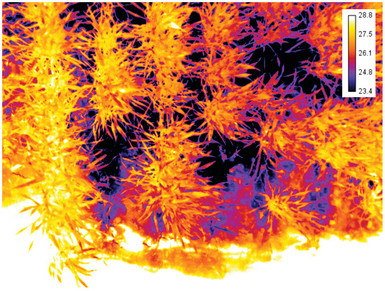 Thermal sensing has been used for many crops, from small grain cereals to maize [99] and fruit trees [100]. It has also been used in combination with spectral sensing for the enhanced estimation of leaf water content [101].