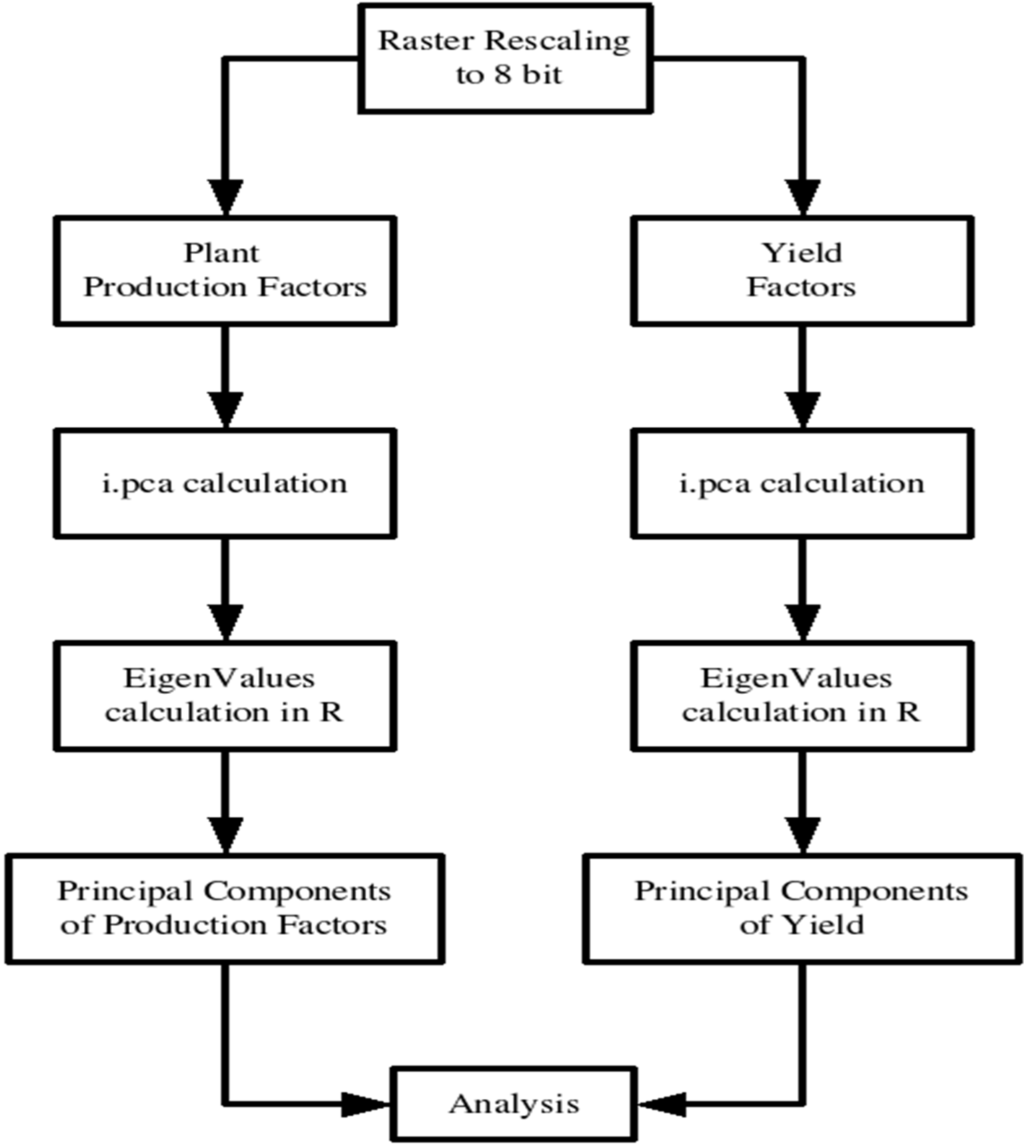 Instead of having several data rasters, the PCA “compressed” the information in a reliable way, facilitating further analysis. The PCA results showed the relation between multiple parameters as well as which plant production factors were explanatory of the yield results. The carbon flux does not relate to any other parameter; therefore, it had a specific PC. Nitrate had two parameter associated to PC3, but the behavior of nitrate is not clear because it also integrates in part PC1. The most important plant production factor was SWC followed by SSA.