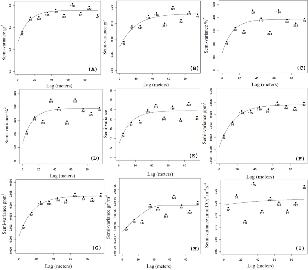 Results of semivariogram and model fitting for the parameter weight of stems (A); weight of plants (B); the soil water content recorded in February 17 (C); the soil water content recorded in June 6 (D); leaf area index recorded March 15 (E); Nitrate in February 17 (F); SSA (G); total weight of grain (H); Carbon flux (I).