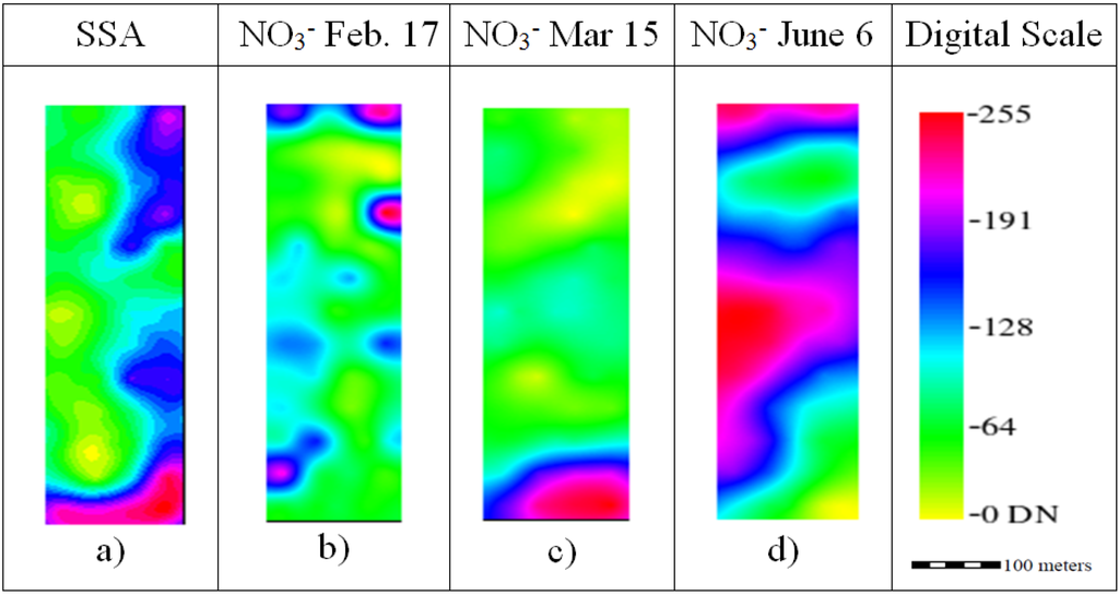 Ordinary kriging raster images rescaled to digital number (DN) range for the production factors Soil Specific Area (SSA) and Nitrate.