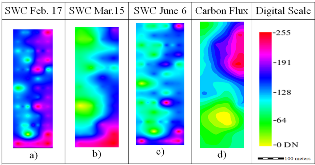 The SWC maps had a similar spatial distribution (Figure 4a–c), with increasing water contents from east to west. The average SWC values decreased from 11.46% ± 0.40% in February (Figure 4a), to 11.20% ± 0.40% in March (Figure 4b) to 3.91% ± 0.37% in June (Figure 4c). The carbon flux had the average measured value of 0.98 ± 0.34 μmol CO2 m−2·s−2, and the distribution of the carbon flux indicates that the upper right part of the field had more organic matter.