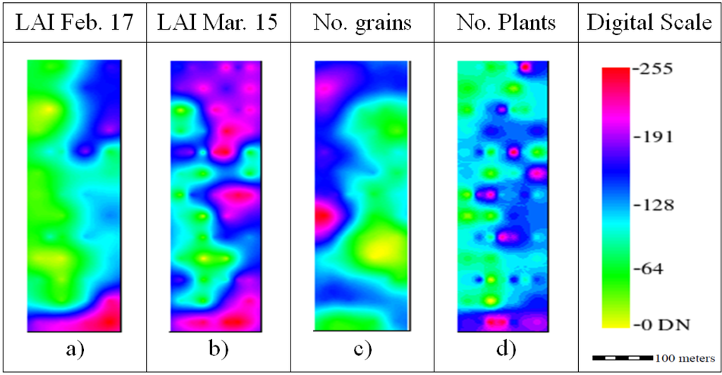 Ordinary kriging raster images rescaled to digital number (DN) range for the yield components Leaf Area Index (LAI), Number of grains and Number of plants.