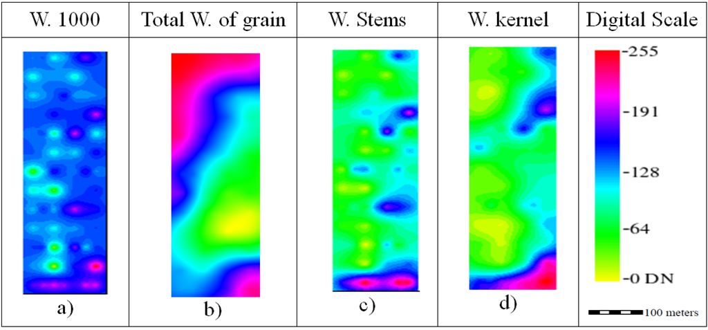 Ordinary kriging raster images rescaled to digital number (DN) range for the yield components weight of 1000 grains, weight of stems and weight of kernel.