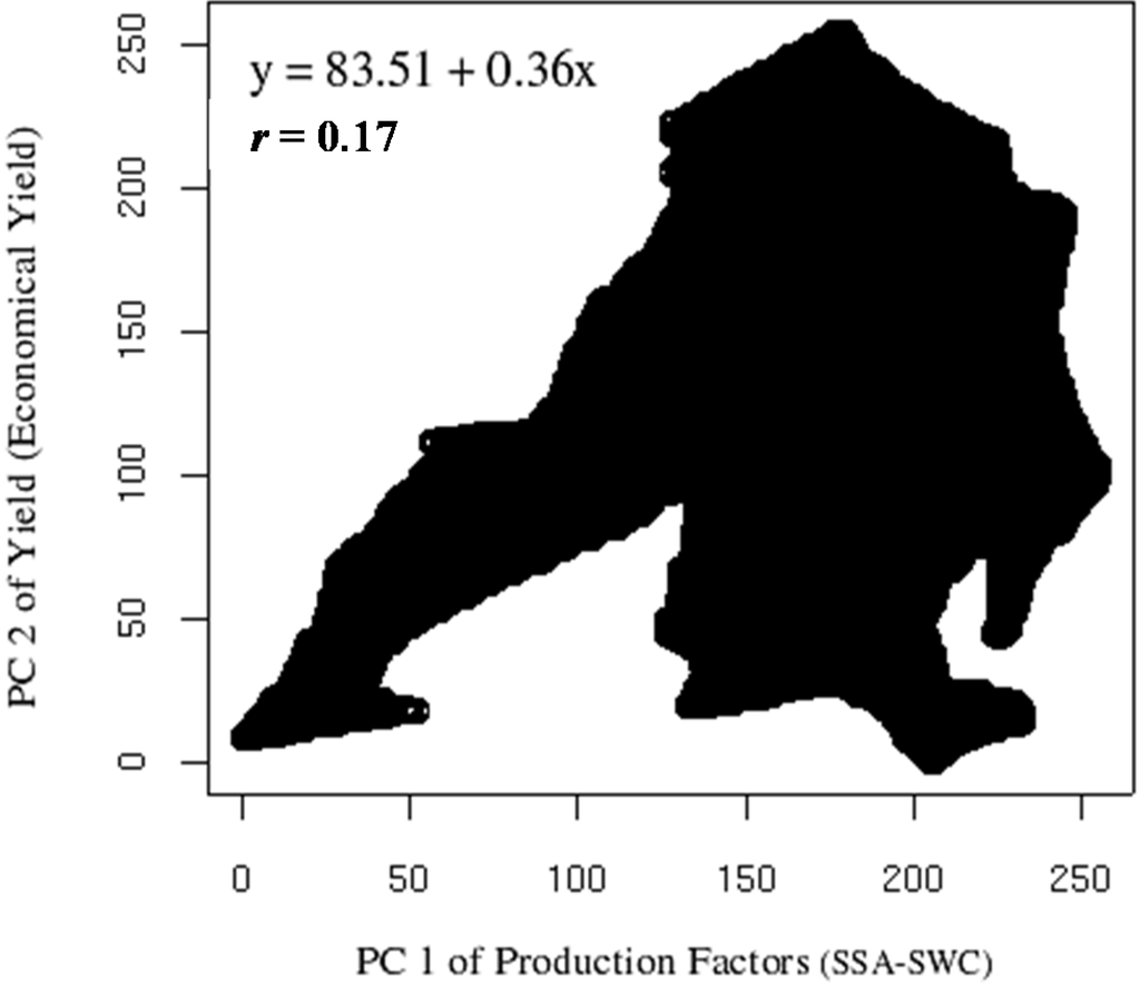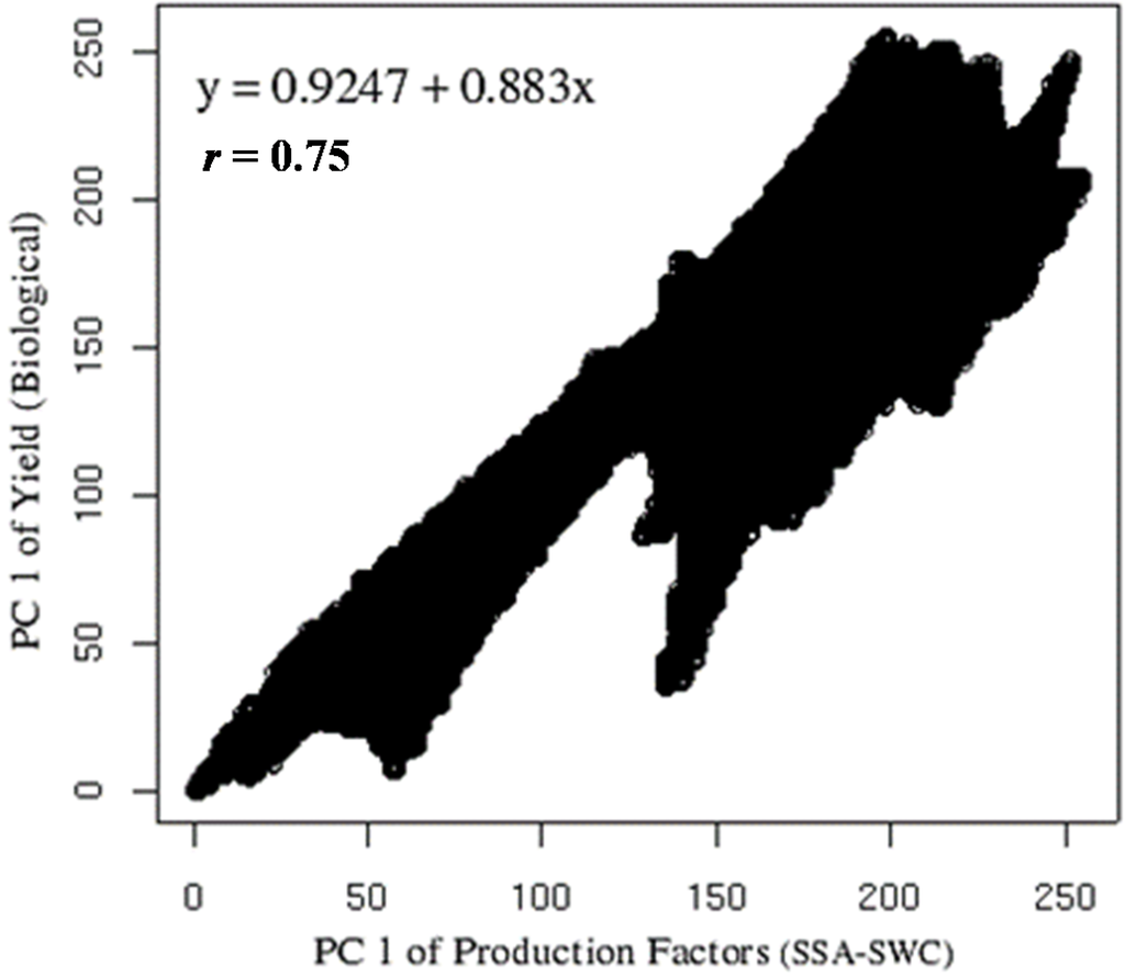 The majority proved that PCA can be used to study the relation between soil properties and that all the different yield factors can be obtained by a correlation between the different PCs of each group. Figure 7 present the correlation between the two rasters, one belonging to the production factor group and the other from yield parameters. It showed a very high coefficient of determination (r = 0.75) with an almost linear behavior (y = 0.9247 + 0.833x). Despite the relation between SSA-SWC with biological yield, this is less important than the relation of economic yield with production factors; therefore there is the need to see how yield parameters are related to SSA-SWC.