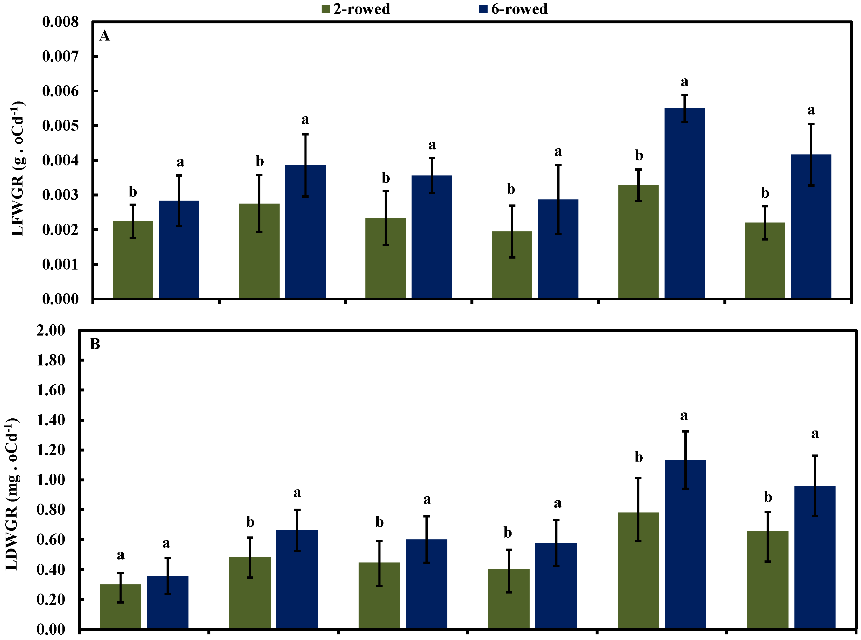 2.4. Leaf Growth Rate in Both Row-Type Classes under Different Growth conditions at Four Developmental Stages