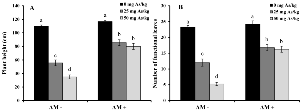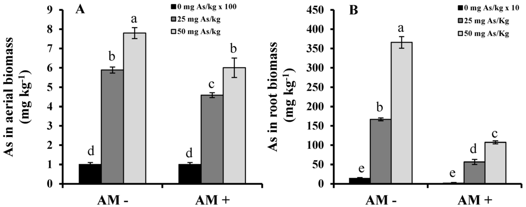 The As concentration in aerial and root biomass (Figure 7) increased following the increases in As in the substrate, as previously found in soybeans [14] and rice [33]. The inoculated plants showed lower As concentration in aerial and root biomass than non-inoculated ones, but the decrease in the roots was clearly more marked. The As concentration in roots was higher than in the aerial biomass, in agreement with other studies [14,34]. However, mycorrhizae altered this relation since AM fungi inoculation reduced to one third the As accumulated in roots, as well as the As accumulated in leaves (although less markedly). Other authors have recorded lower As concentrations on mycorrhized plants such as maize [29], tomato [31], lentil [35], clover [36], sunflower [37], rye grass and white clover [38], and plants growing on As-contaminated areas [26]. They have stated different hypotheses: (i) mycorrhizal inoculation improves the plant yield and causes a dilution effect in the As concentration; (ii) AM fungi hyphae exhibit a great variety of free groups such as hydroxyl, carboxyl, and amino acids, which could bind to As, retaining it in the fungal tissues and reducing the As intake by roots. (Also, these chemical groups could enter the root cells, modifying the cell wall and decreasing the As translocation to aerial organs.) [20]; (iii) the AM fungi–plant association immobilizes As in roots, reducing its translocation toward leaves and other plant organs [39,40,41,42].