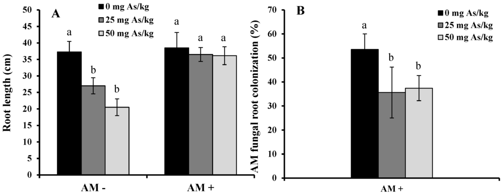 The plant height and number of leaves (Figure 2) showed a similar behavior to aerial biomass. Root length decreased significantly in non-inoculated plants while roots of inoculated plants showed the same length as that of the control treatment (0 mg As kg−1 substrate) (Figure 3). In our study, morphological traits of non-inoculated soybeans, like height, leaf number, and root length, were severely affected by the addition of As, as found by Bustingorri and Lavado [14]. This decrease in both root and shoot length is a typical response to toxic metals [27,28]. When soybean plants were inoculated with AM fungi, the effect of As was less marked, especially on root length.