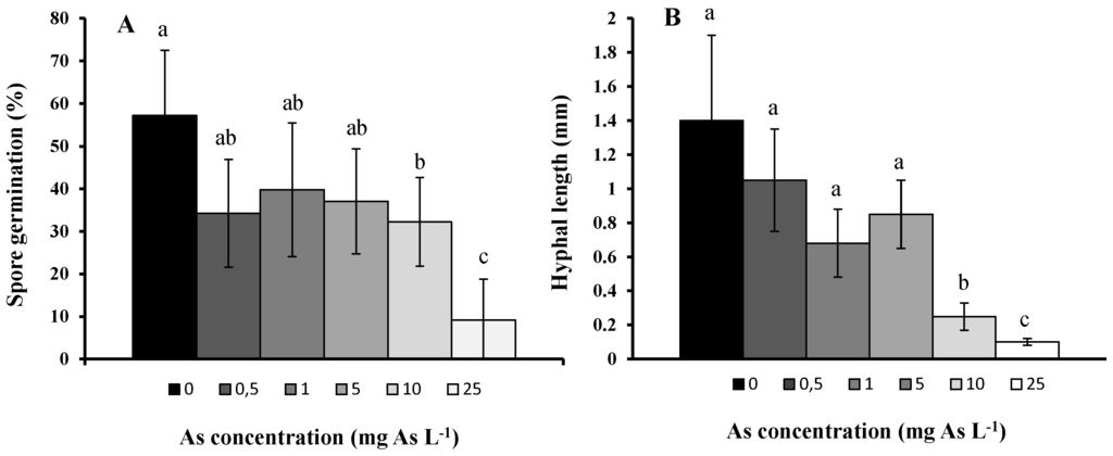The effect of As on the fungi was evaluated in vitro. In this test, 1% water-agar was used as a medium and As was added at the doses of 0, 0.5, 1, 5, 10, and 25 mg As L−1. Rhizophagus intraradices spores, previously sterilized, were used. Each treatment was replicated 20 times and five spores were sowed in each replication. It was incubated and the spore germination and the hyphal length were observed using an optical microscope and an ocular micrometer [51].
