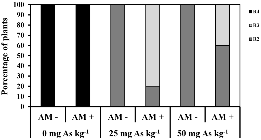 Figure 5 shows the phenological evolution of all soybean plants at harvest time (70 days), expressed as a percentage of the number of plants. This data show that soybean plants reach different stages according to the treatment. Control, inoculated, and non-inoculated plants reached the R4 stage (plants with pods completely formed) while all non-inoculated plants exposed to 25 and 50 mg As kg−1 reached R2 stage (plants in full flowering). AM fungi inoculation partially reversed this delay: 80% of the plants subjected to 25 mg As kg−1 reached the R3 stage (starting pod formation) while 40% of the plants subjected to 50 mg As kg−1 reached the R3 stage. The rest of the plants showed the R2 stage. Arsenic slowed the crop phenological evolution but mycorrhiza helped the plants to advance more regularly in their cycle.