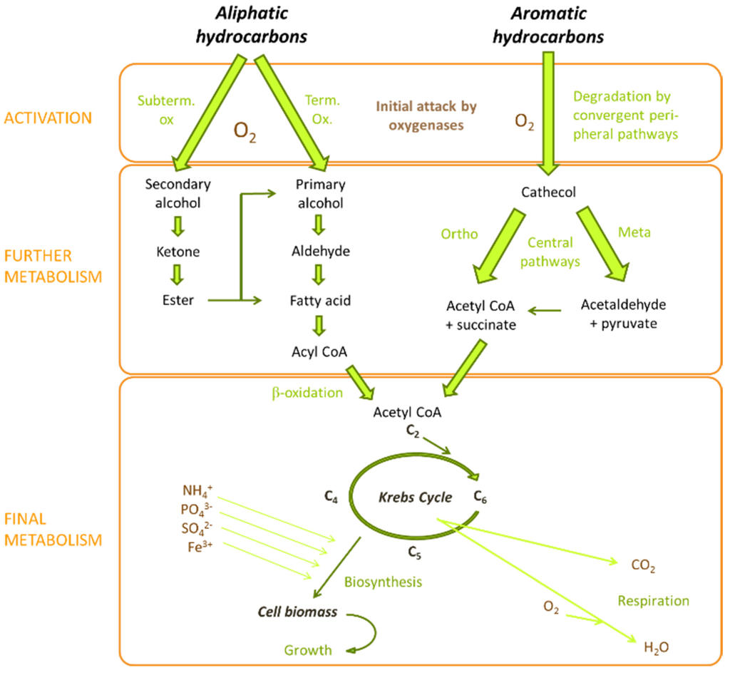 Degradation of aliphatic and aromatic hydrocarbons by aerobic bacteria. Subterm. ox.: subterminal oxidation; Term. ox.: terminal oxidation; Ortho: ortho cleavage pathway; Meta: meta cleavage patway; CoA: coenzyme A. [,,,,,,].