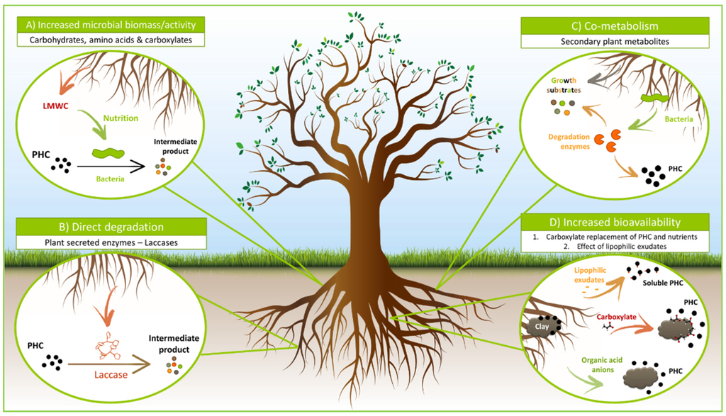 Plant roots may enhance microbial biodegradation of petroleum hydrocarbons via physical processes such as nutrient and pollutant transport, microbial attachment sites and soil aeration (Figure 3) []. The first and most significant role of root exudates in the improvement of petroleum hydrocarbon degradation is that they provide microorganisms with a source of energy and nutrients, which supports their growth and activity [,] (Figure 3A). The forms of carbon and nitrogen exuded by roots, i.e., high molecular weight organic polymers, are complex and mostly insoluble []. Therefore, they may have relatively long biodegradation times [,]. Increasing the microbial biomass and activity by exudation of labile C and N can be a solution. For example, the addition of root debris to phenanthrene contaminated soils only improve phenanthrene degradation after 20 days, in contrast to more labile water soluble exudates, which reflects the low biodegradability of the root debris []. In contrast, the high solubility of low molecular weight exudates allows them a higher mobility in soil and a rapid uptake by microbial cells []. Carbohydrates, amino acids and organic acid represent the largest proportion of low molecular weight root exudates, and are fundamental to the provision of easily degradable energy and nutrient sources to the rhizosphere []. For example, the addition of low molecular weight root exudates can generate a rapid response (within 1 h) in the microbial respiration. However, several days may be required to observe changes in gene expression and microbial biomass [,]. Furthermore, root secreted compounds involved in plant nutrient acquisition, such as enzymes (e.g., acid phosphatases), protons and chelating agents (e.g., organic acid anions and other phytosiderophores), also provide a source of nutrients to rhizosphere microorganisms [,,,].
