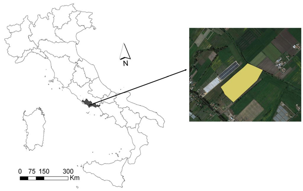 Location of the study area in Latina Province (Central Italy). The yellow area outlines the experimental field.
