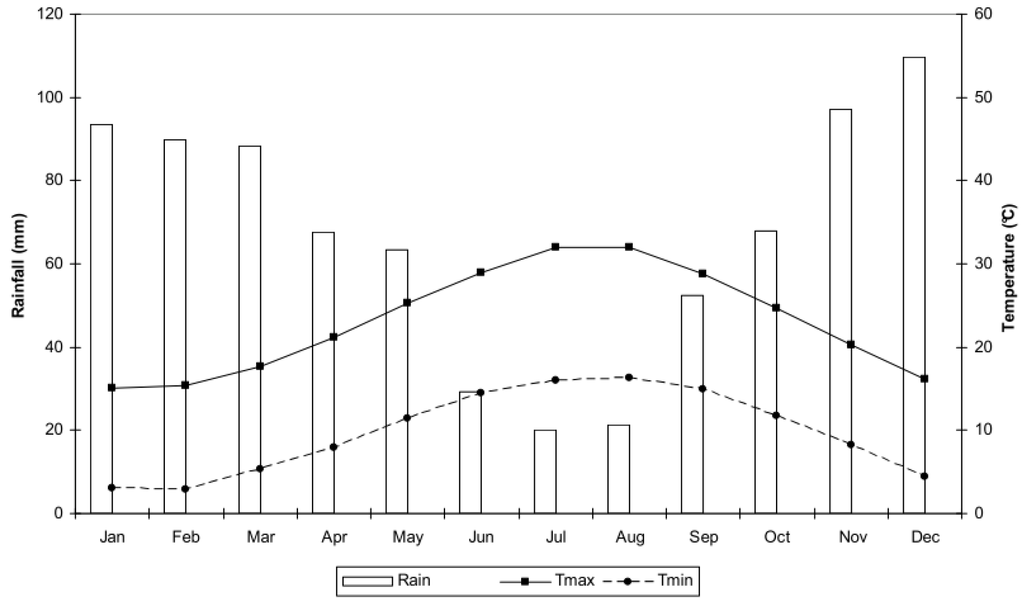 Monthly mean maximum and minimum temperature, and monthly total rainfall in Sabaudia area, Latina Province (Central Italy).