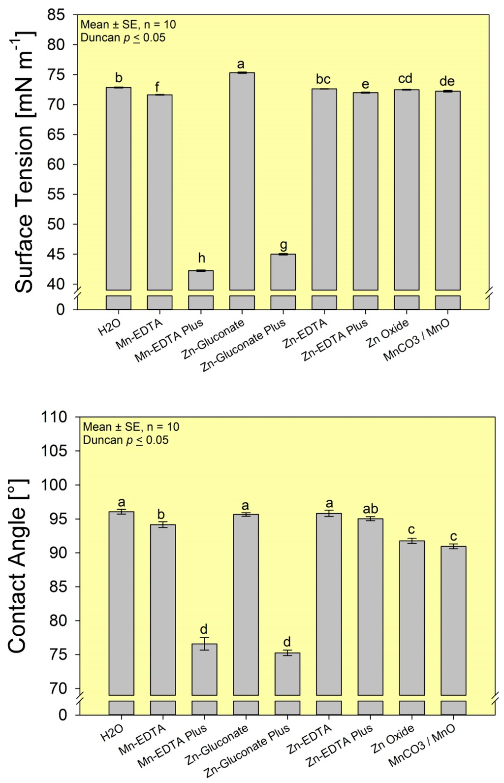 Surface tension and contact angle of solutions of the non-formulated Mn- and Zn-sulfate salts. Values indicate the mean (±SE; n = 10). Means were separated according to Duncan’s multiple range test (p ≤ 0.05), values followed by different letters are statistically different.