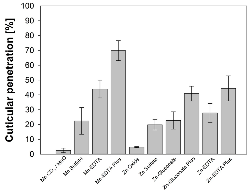 The experimental conditions used in this study (high relative humidity >90% and long penetration time) were selected to enable high cuticular penetration by all metal carriers involved. The use of a novel penetration enhancer significantly reduced the surface tension, as well as the contact angle, and the penetration rate of Mn could be considerably increased. In the case of Zn, this enhancing effect was remarkable in combination with the EDTA-chelated metal, but remained only slight with the gluconic acid-chelated Zn molecule. The comparative penetration rates of the Mn and Zn salt solutions also demonstrate that Zn ions penetrate at a distinctly slower rate through tomato cuticles than Mn ions. The reason for this difference is unknown, but might be due to specific cuticular interactions. The bio-efficacy of nutrient ions strongly depends on their penetration rate because uptake from the outer to the inner surface is the most limiting step. Compounds having higher penetration rates, as observed in this experiment, might enable higher biological efficacy under real field conditions.