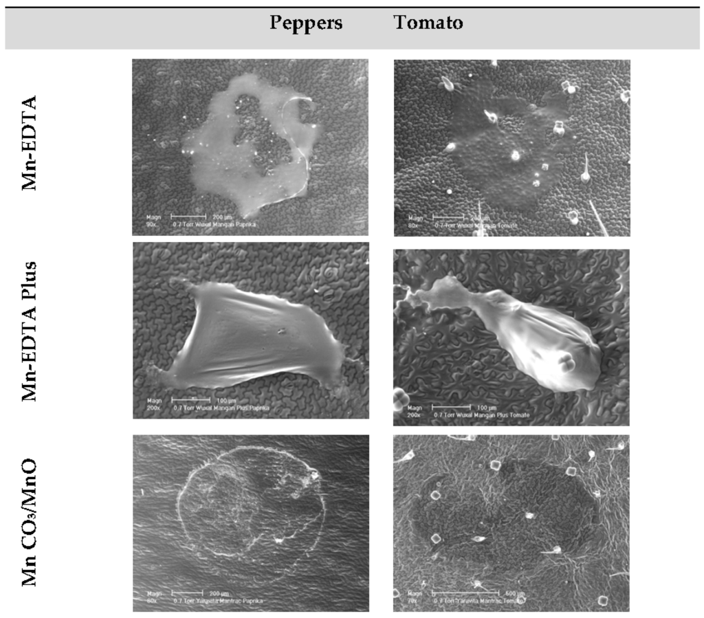 Figure 5 shows representative deposits of the Mn-containing formulated products applied at the adaxial surface of peppers and tomato leaves. While the products Mn-EDTA and Mn-EDTA Plus formed rather concentrated and thick deposits, the MnCO3/MnO product formed a deposit with more homogeneous distribution of dissolved/suspended particles leading, in many cases, to the occurrence of “coffee-ring” depositions, as previously observed for agrochemicals and adjuvants. Presumably, this small, but concentrated, deposit might have contributed for the higher cuticular penetration observed for Mn-EDTA Plus.