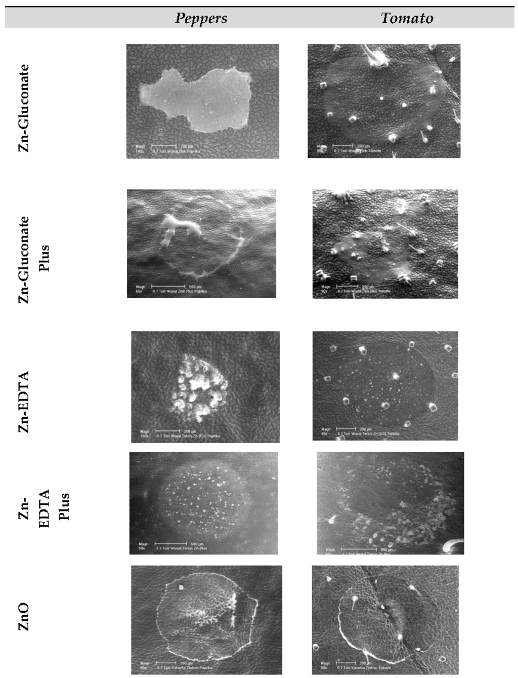 Figure 6 displays characteristic deposits of the formulated Zn-containing compounds when applied to the surface of peppers and tomato leaves. As shown, deposit characteristics were influenced by both treatment solutions and plant surfaces. In general, due to the shape and agglutination forms, deposits were easier to detect on the leaf surface of peppers. In case of Zn-Gluconate, Zn-Gluconate Plus, and Zn-EDTA easily identifiable deposits, often concentrated in smaller regions, were formed. Particularly for Zn-EDTA, fine crystalline structures were observed. Differently, Zn-EDTA Plus produced a more homogeneous deposit, whereas the ZnO-formulation produced a pronounced ‘coffee-ring’ like deposit.