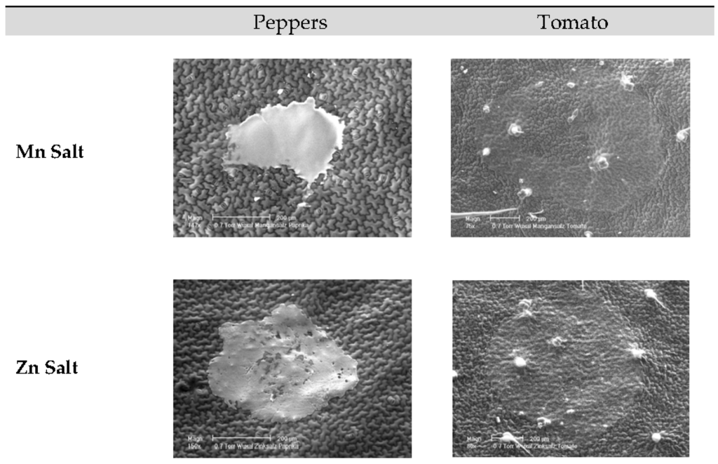 The size and shape of deposits as analyzed with scanning electron microscopy strongly depends on the characteristics of the leaf surface. The formulations based on insoluble Mn and Zn compounds evidenced a very low cuticular penetration. This might be explained by their poor water solubility and, additionally, may be associated with the crystallization on the leaf surface. This is also documented by the SEM pictures.