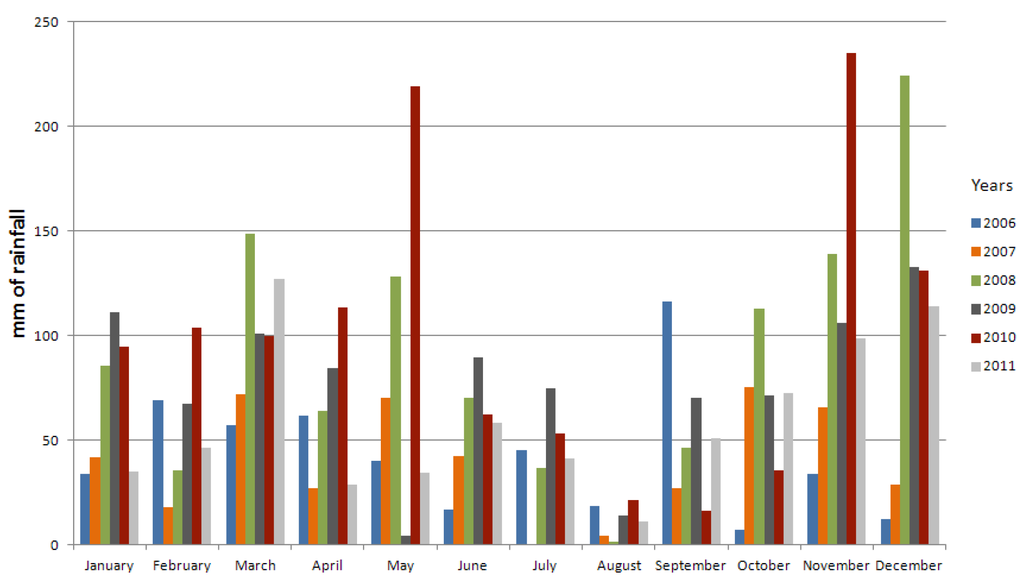 Monthly rainfall data of the experimental site during the tests (2010–2011). Data since 2006 indicate the climatic average.