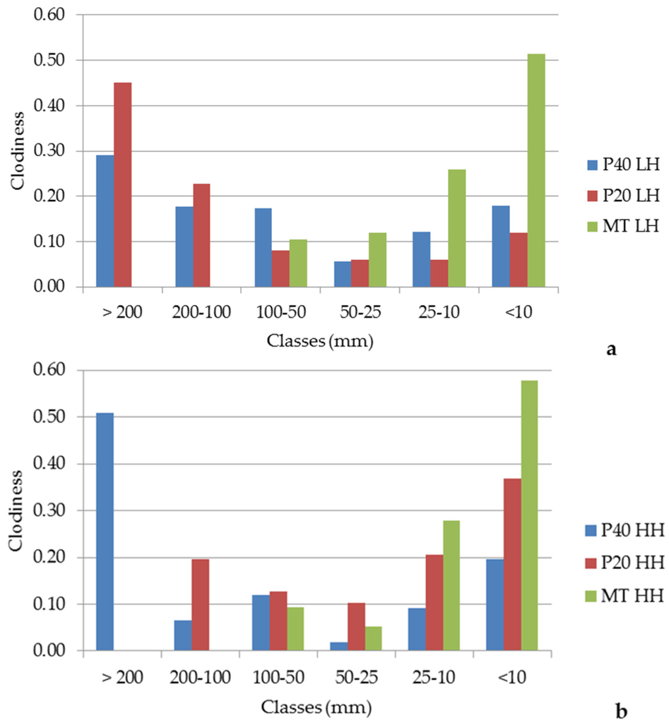Because it influences the quality of the tillage, the clod size distribution showed a good quality, especially for the treatments P20 HH and MT HH, where a high percentage of clods less than 50 mm and the absence of clods greater than 200 mm were found (Figure 2b). The others treatments showed: (i) higher percentage of clods larger than 200 mm (50%) for P40 HH and (30%) for P40 LH; (ii) almost the same trend under the LH and HH conditions for the MT treatments and (iii) opposite trend under the LH and HH conditions for P20 treatments where LH had more than 40% of clods larger than 200 mm and approximately 10% of clods smaller than 10% (Figure 2a).