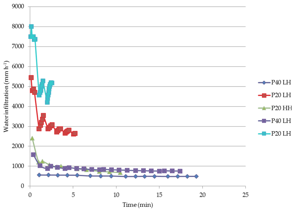 Regarding the water infiltration rate of the soil, the results depicted in Figure 3 showed that, due to the hard field conditions of the silty loam soil, only the 3 following treatments had results: P40 LH and P20 LH (2 replications), P20 HH (1 replication). In particular, the highest values of the infiltration rate (above 2500 mm·h−1) was obtained for P20 LH, similar values (between 500 and 1000 mm·h−1) were obtained for the treatments P40 LH and P20 HH and finally, a value equal to 0 for the MT treatment were obtained.
