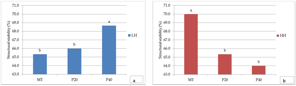 Findings of structural stability of soil aggregates showed that treatment P40 had the highest structural stability value within the LH treatments (68.7%). Treatments P20 and MT showed quite similar values, 66% and 65.3%, respectively (Figure 4a). Results of tests conducted on HH treatments showed that the best effect on structural stability was created by the MT treatment (70%), while ploughed plots showed values of 65.3% and 64% for P20 and P40, respectively (Figure 4b).