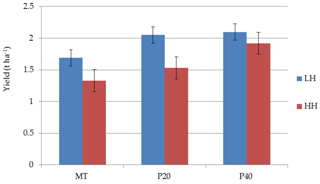 According to the structural stability of soil aggregates, the results of wheat yield (Figure 5) showed that grain yield under the LH condition was higher for the P40 treatment (2.1 t·ha−1) and for P20 (2.05 t·ha−1), it was lower for MT (1.7 t·ha−1). The trend of grain yield under HH was similar to that of the LH condition: higher for P40 (1.9 t·ha−1) and for P20 (1.5 t·ha−1), lower for MT (1.3 t·ha−1). Figure 5 shows the values of differences in grain yield with respect to the treatment P40 (treatment P40 was chosen as the control because it represents the traditional tillage of this crop). Concerning condition LH, P20 and P40 produced the same amount while MT produced 23% less; regarding the HH condition, P20 and MT produced 26% and 46% less, respectively, than P40. The grain yield of each treatment in LH was higher than the respective treatment HH: treatments P40 and P20 produced the highest, MT the lowest.
