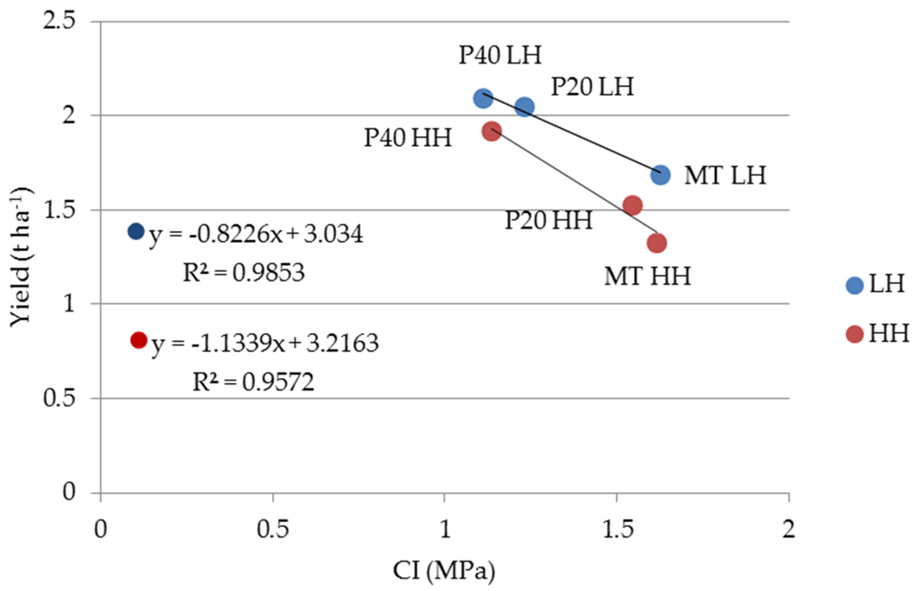 Besides, according to other studies [24], a highly significant linear relationship between grain yield and soil penetration resistance (p ≤ 0.01) was found, highlighting how soil physical-mechanical parameters may be good indicators of productivity. In fact, the results showed that under the field conditions of the tests, the crop yield decreases when the soil strength, in terms of the Cone Index, increases (Figure 6). Even if the best tillage operation is used, there is a compromise among targets: machines, meteorological conditions, yield, soil status, and costs. The obtained results showed that the MT and P20 treatments are suitable for these field conditions under climate change scenarios because MT was not affected by the soil water content, and P20 was a good compromise among targets.
