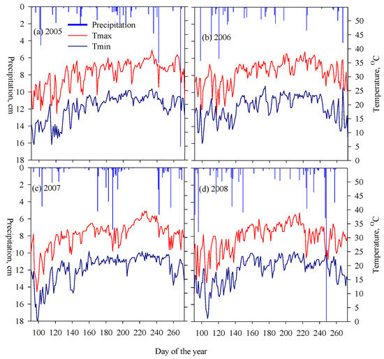 Weather recorded at Stoneville, Mississippi during the crop seasons (April–September) of 2005 (a), 2006 (b), 2007 (c), and 2008 (d): maximum and minimum temperature and precipitation.