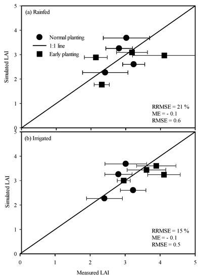 Increased leaf area growth under irrigated conditions was well captured in the simulations. Across early and normal planting dates, LAI gain due to irrigation as measured in the field experiment was 0.35, against 0.32 in the simulations. Under irrigated conditions, cotton planted on the normal planting dates produced higher LAI than the early-planted cotton by 0.78, and this was well captured by the model with a simulated gain of 0.37. Under rainfed conditions, similar LAI gain in the experiment was 0.07 and the model simulated a loss of −0.27. This reverse in trend may have been an artifact of the larger plant-to-plant variability in the measured LAI under rainfed conditions.