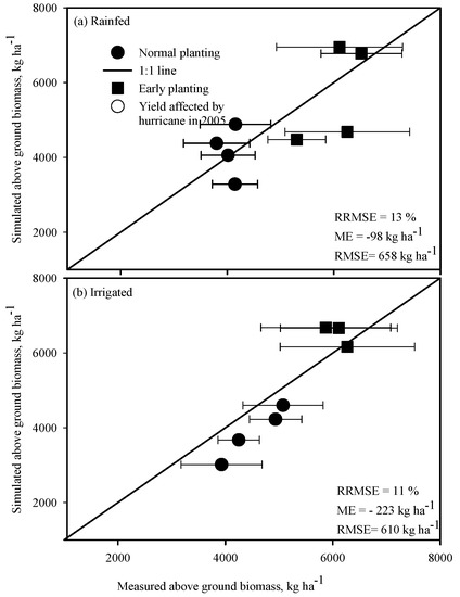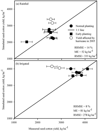 A high intensity hurricane named “Katrina” made landfall in the New Orleans coastal area on 25 August 2005, bringing heavy winds and rainfall over the MS Delta region that damaged the cotton crop in our experiments. This event occurred three weeks before harvest of the crop, and damage was reflected only in the measured seed cotton yield but not in the biomass and LAI, since they were measured before this damage occurred. As there was no way to account for and simulate hurricane-related crop losses in agricultural system models, the simulated seed cotton yield for 2005 were conspicuously greater than the measured data (Figure 4). The simulated data for 2005, therefore, were excluded from calculations of simulation error statistics of seed cotton yields. With this exception, seed cotton yields were simulated with accuracy levels comparable to those of LAI and biomass. Averaged across early and normal planting dates in the irrigated experiments, errors in seed cotton yield simulations were RRMSE = 14%, RMSE = 333 kg·ha−1, and ME = 52 kg·ha−1. Similar errors resulted from the rainfed experiment simulations, with RRMSE = 8%, RMSE = 278 kg·ha−1, and ME = 81 kg·ha−1. The slight positive biases in the prediction of seed cotton yield under both rainfed and irrigated conditions were not severe enough to warrant any adjustments in the model calibration to remove those biases. Seed cotton yield gain with irrigations compared to the rainfed crop were also well simulated: across the two planting dates, the simulated yield gain was 1339 kg·ha−1 compared with the field-measured yield gain of 1369 kg·ha−1. The trend in yield reduction during the experimental period due to later planting, under both rainfed and irrigated conditions, were also well simulated. Under rainfed conditions, the simulated reduction was 6 kg·ha−1 while the measured yield reduction was 285 kg·ha−1, and under irrigated conditions, the simulated yield reduction was 136 kg·ha−1 compared with a measured yield reduction of 334 kg·ha−1.