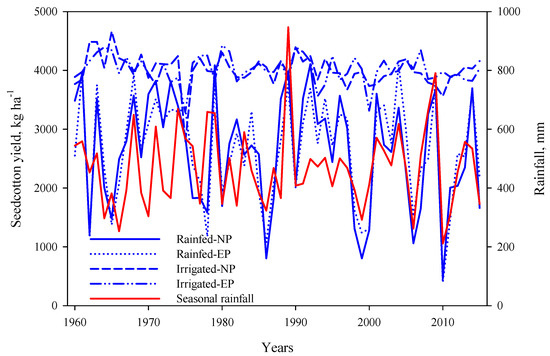 Simulated seed cotton yields of normal (NP) and early plantings (EP) under rainfed and irrigated conditions from 1960 to 2015 at Stoneville, MS. The EP was on 30 Mach and NP was on 2 May.