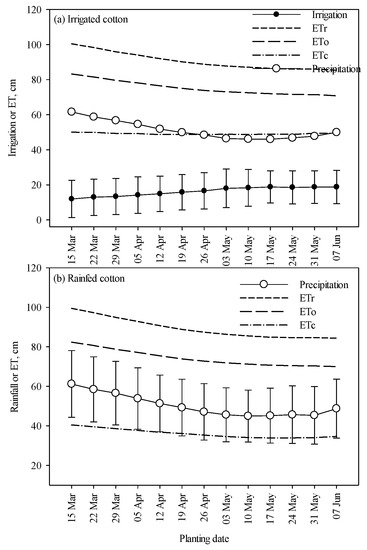 Long-term (1960–2015) average rainfall received during the simulated cotton growth periods for plantings from 15 March to 7 June varied between 46 cm (SD = 13 cm) and 62 cm (SD = 17 cm) (Figure 6a,b). The rainfall capture during the crop growth period was highest for the 15 March planting (62 cm) and declined with the delay in planting, in general, with a minimum rainfall capture observed for the 17 May planting (46 cm). On average, during 1960–2015, 51 cm (SD = 14 cm) of rainfall was received, and average 15 cm (SD = 10 cm) of water was needed per season for irrigating the crop. Average computed long-term short grass reference-crop evapotranspiration (ETo, Allen et al., 1998 [44]), afalfa reference-crop evapotranspiration (ETr, ASCE-EWRI, 2005 [45], and model-simulated actual crop evapotranspiration, ETc, for the crop growth period were 74, 89, and 48 cm, respectively. Average simulated ETc under rainfed conditions was 36 cm, resulting in a deficiency of 12 cm of ETc compared to the irrigated crop, which accounted for an average seed cotton yield loss of 808 kg·ha−1 (average simulated yield under irrigated conditions was 3051 kg·ha−1 and simulated yield under rainfed conditions was 2243 kg·ha−1).