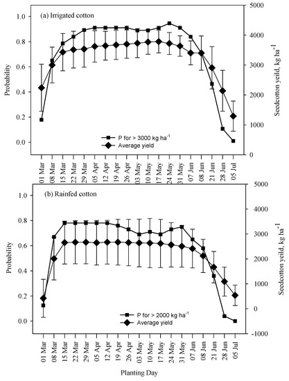 Under irrigated conditions, planting in the first week of March produced an average seed cotton yield of 786 kg·ha−1 followed by 3001 and 3433 kg·ha−1 for 8 March and 15 March plantings, respectively (Figure 7). From 22 March planting and beyond, a much slower gain in yield—about 29 kg·ha−1 per week delay of planting until 24 May—was observed (Figure 7a). Probabilities of achieving seed cotton yields greater than 3000 kg·ha−1 were between 89% for the 24 March planting and 94% for the 24 May planting (Figure 7a).