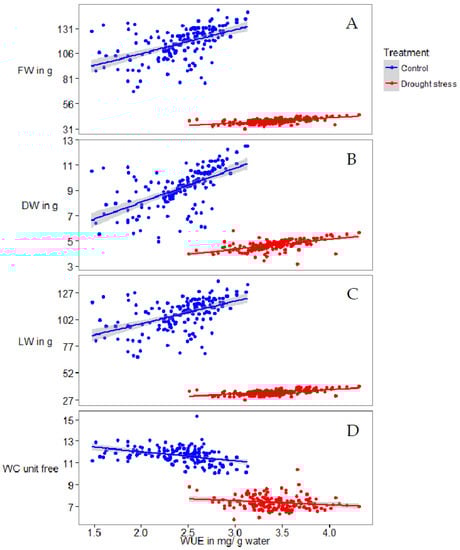 Correlations between the traits analysed are shown in Table 3. The highest correlations (p < 0.001) were estimated between FW and LW with r = 1 for control and r = 0.98 for the drought stress treatment (Table 3). The strong relationship of both traits resulted from the calculation of LW out of FW and DW. Thus, also between LW and DW, highly significant correlations were calculated with r = 0.91 for control and r = 0.48 for drought stress treatment. Furthermore, DW and FW were also significantly correlated for control (r = 0.92) and drought stress treatment (r = 0.59). The same holds true for WC and WUE, which were related on a dry weight basis, which explains the correlation between WC and DW as well as between WUE and DW of r = −0.54 and r = 0.64 for control and r = −0.60 and r = 0.65 for drought stress treatment, respectively. Between LW and WC, a significant (p < 0.01) but rather low correlation was calculated, i.e., r = −0.22 for control and r = 0.31 for drought stress. Both traits were significantly correlated to the WUE with r = 0.54 and r = −0.44 for control as well as r = 0.54 and r = −0.22, respectively, for the drought stress variant (Table 3).