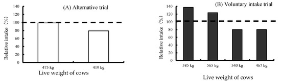 Relative dry matter (DM) intake in Mower/baler plot to Flail/baler plot (as a percentage) in the two palatability tests from dwarf Napiergrass silages in Experiment 2. (A) The DM intake over 2 h was determined using two paired Japanese Black breeding cows (mean live weight (LW): high live weight (HLW) plot = 475 kg, low live weight (LLW) plot = 419 kg) with a one-day preliminary period followed by a three-day examination period; (B) The DM intake per day, determined using four Japanese Black breeding cows (mean LW = 485.5 kg) with a two-day preliminary period followed by a three-day examination period.