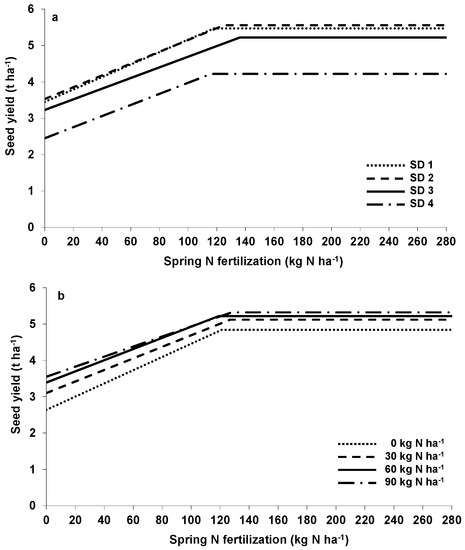 Spring N supply boosted seed yield (Figure 1a; for estimated model parameters, see Table 2). However, N amount that exceeded 116–136 kg·N·ha−1 depending on the sowing method failed to show any further increase. The comparison of the function parameter revealed that the sowing method only influenced the level of the yield plateau ranging between 4.23 t·ha−1 if sown in the third week of September (SD 4) and 5.56 t·ha−1 at the third week of August (SD 2). In contrast, the N application rate at the intersection of the linear model and the plateau yield (Nopt), as well as the linear slope, remained unaffected (Table 2) indicating that the sowing method (SD) by spring N interaction was not significant.