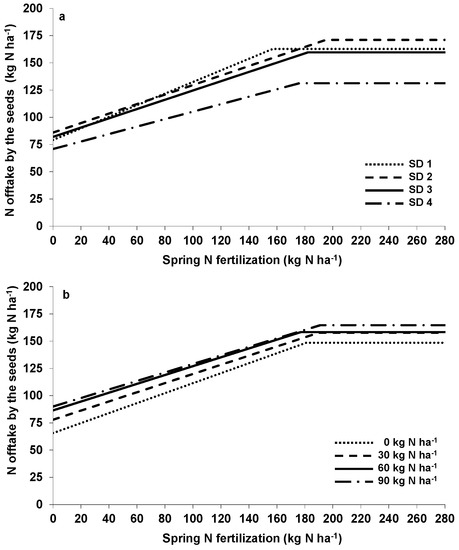 Effect of sowing method (SD) by spring N fertilization interaction (a) and autumn N by spring N fertilization (b) on N offtake by the seeds of oilseed rape (2010, 2011, 2013; for function parameters, see Table 2). (SD 1—first week of August; SD 2—third week of August; SD 3—first week of September; SD 4—third week of September).