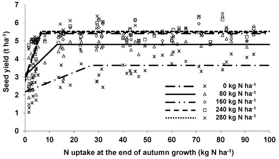 2.5. Relation between Above-Ground N Uptake in Autumn and Seed Yield