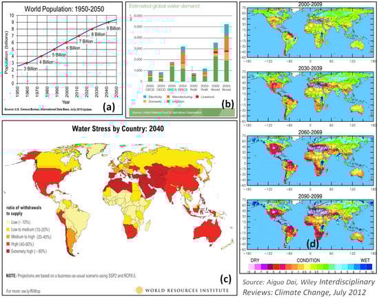 (a) Projected population curve (source: U.S. Census Bureau, International database 1950–2050, July 2015 update); (b) estimated global water demand (OECD: Organization for Economic Cooperation and Development; BRIC: Brazil, Russia, India and China; RoW: Rest of world; source: United Nation Food & Agriculture Organization); (c) severity pattern of water stress by country by 2040 (source: World Resource Institute); (d) estimated possibilities for future drought worldwide based on the Palmer Drought Severity Index (source: Aigup Dai, Wiley interdisciplinary Reviews: Climate Change, July 2012).