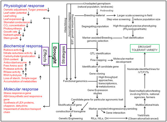 Comprehensive information, early warning systems and cultivation of high-yielding, high-quality, drought- plus biotic stress-tolerant varieties in drought-prone areas could provide a solution to the problem of drought. Identification and introduction of suitable traits that narrow the gap between expected and actual yield; understanding realistic physio-morpho-molecular mechanisms of drought tolerance; and designing a standard screening method for a large population [73] could contribute to the development of drought-tolerant rice varieties. Adopting proper strategies such as larger scale standardized screening for grain yield under drought and understanding the components of yield based on morpho-physiological traits could contribute to breeders’ efforts to develop better drought-tolerant varieties. Conventional and marker-assisted breeding strategies based on the use of drought-tolerant donors, pre-breeding to use the lines derived from crosses involving donors, and the development of suitable mapping populations to identify QTLs/genes affecting yield could result in yield improvement and stability under drought stress. Breaking undesirable linkages between drought tolerance and tall plant height, drought tolerance and earliness, and drought tolerance and low yield potential [74] could help to develop semi-dwarf drought-tolerant varieties without any yield penalty. Molecular, cellular, physiological, biochemical, and developmental responses to abiotic stress involve several genes and gene functions controlling drought tolerance. Several efforts have been made to better understand the expression of drought-tolerance-related traits and the complex network of drought-related genes. Exogenous application of hormones and osmoprotectants to seed or growing plants, engineering for drought resistance, and high-throughput novel technologies could be useful tools in identifying genes to improve yield under drought (Figure 2).