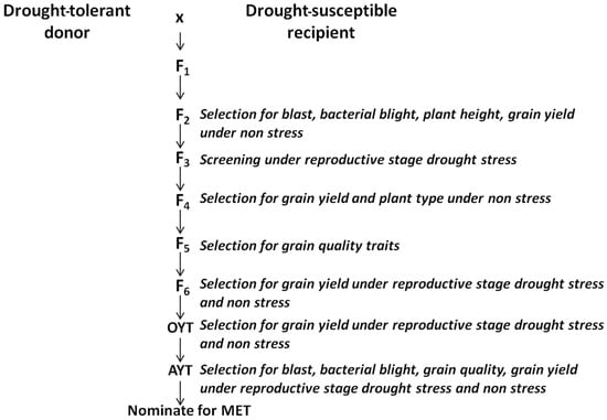 The preliminary and important step of any breeding program involves the identification of suitable donors. Selection of a specific donor from a large germplasm collection is a crucial step. The use of a specific donor with special characteristics for a specific environment may lead to the success of any varietal and trait development program. Most of the traditional donors have several undesirable traits and therefore are not suitable for direct use in any breeding program. These landraces have undesirable traits such as little ground cover, tall plant height, low yield potential, and poor grain and eating quality, but they have a desirable drought tolerance trait. On the other hand, modern rice varieties have desirable traits such as high yield, improved plant type (early vigor, medium height, and lodging resistance), tolerance of biotic stress, and good grain type (medium to long slender). However, they are drought-susceptible. Breeding for any desired trait to get new gene combinations requires exploitation of genetic variation (intra-specific, inter-specific, or inter-generic) that exist in traditional landraces carrying desirable characteristics and modern improved varieties with high yield potential [153]. The genotype at par performance in the target environment [154] and the trait with high heritability [155] can account for further high-throughput screening. The identified drought-tolerant donors such as PSBRc68, PSBRc80, PSBRc82, Aday Sel, Dagaddeshi, Kali Aus, Aus276, Kalia, N22, Apo, Dular, and IR77298-14-1-2 have been used in conventional breeding and QTL mapping studies at IRRI. Among these, improved donors such as PSBRc68, PSBRc80, PSBRc82, and IR77298-14-1-2 have been directly used in conventional breeding programs, whereas improved drought-tolerant lines free from undesirable linkages were derived from the mapping populations that involve traditional donors such as Aday Sel, Dagaddeshi, Kali Aus, Aus 276, Kalia, N22, Apo, and Dular and used in conventional breeding programs. In marker-assisted breeding programs, lines possessing the identified QTLs for grain yield under drought, which come from mapping populations that involve traditional donors, were used to improve mega-varieties.