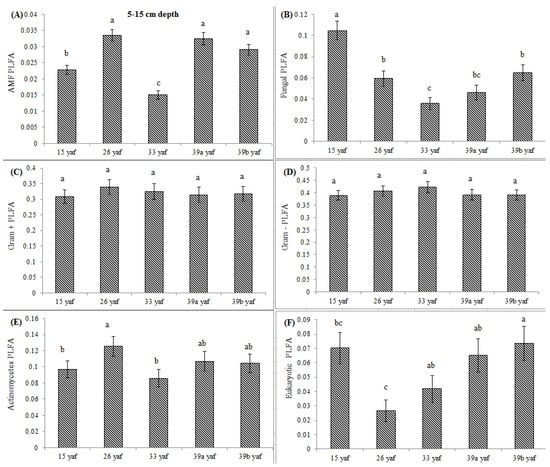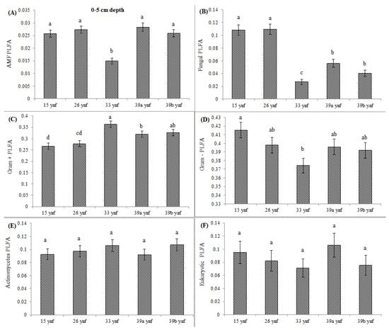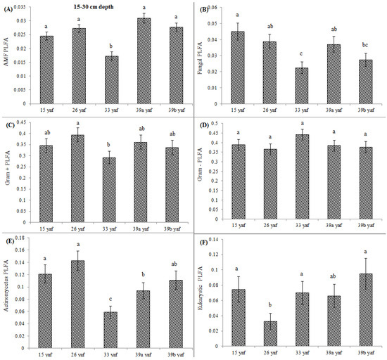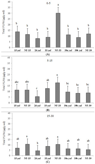 Soil microbial community biomass represented by total PLFA was significantly (p < 0.05) higher in NF-33 site as compared to the fumigated 33 yaf site at the first 5 cm depth (Figure 1A). At the 5–15 cm depth, total PLFA in NF-33 site was higher than in fumigated 26, 39a, 39b and non-fumigated 39 sites; whereas at 15–30 cm depth, total microbial biomass in non-fumigated sites (33 and 15) was higher in comparison to 26 yaf site (Figure 1B,C).